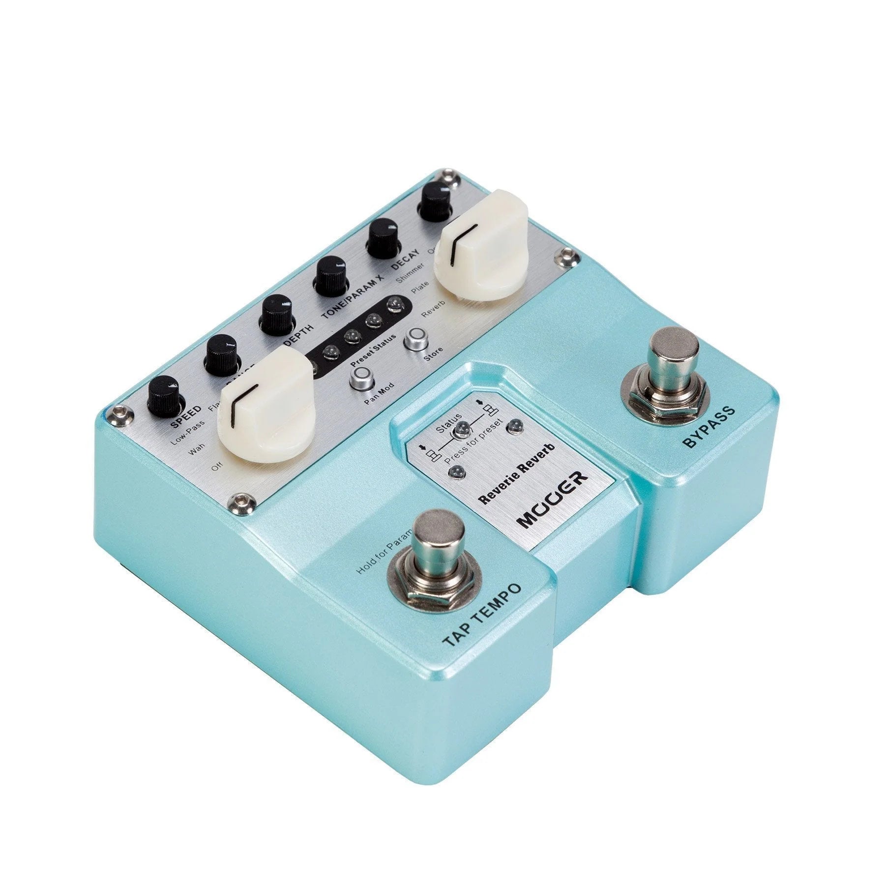 The Mooer MEP-REVREV Reverie Reverb is a compact dual effects pedal housing 5 unique basal reverb tones: Reverb, Plate, Shimmer, Octave and Modulation. Each could be fit for the Wah, Low-Pass, Flanger, Tremolo and Water effect respectively. You can also turn the modulation effect off to get pure reverb tone.