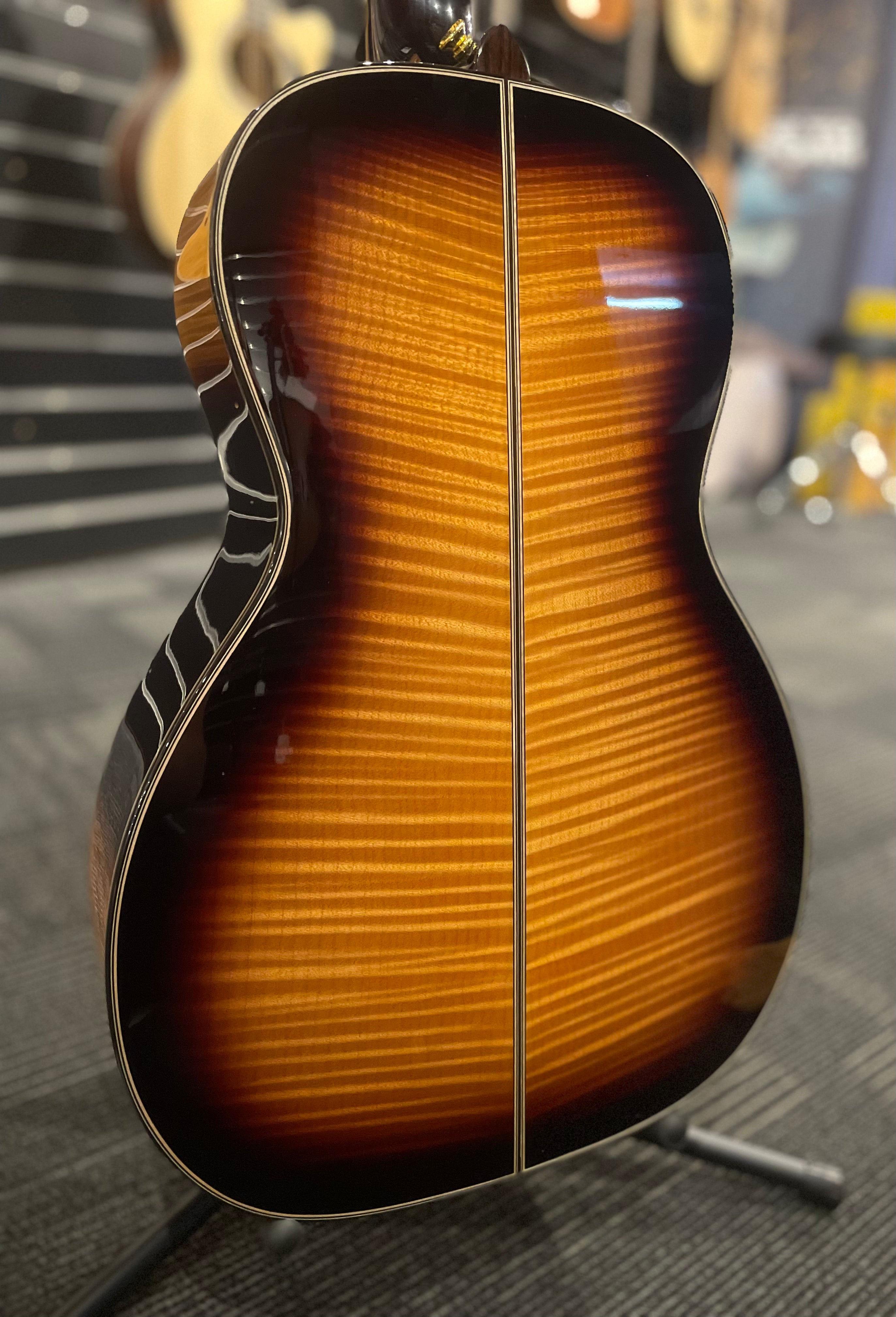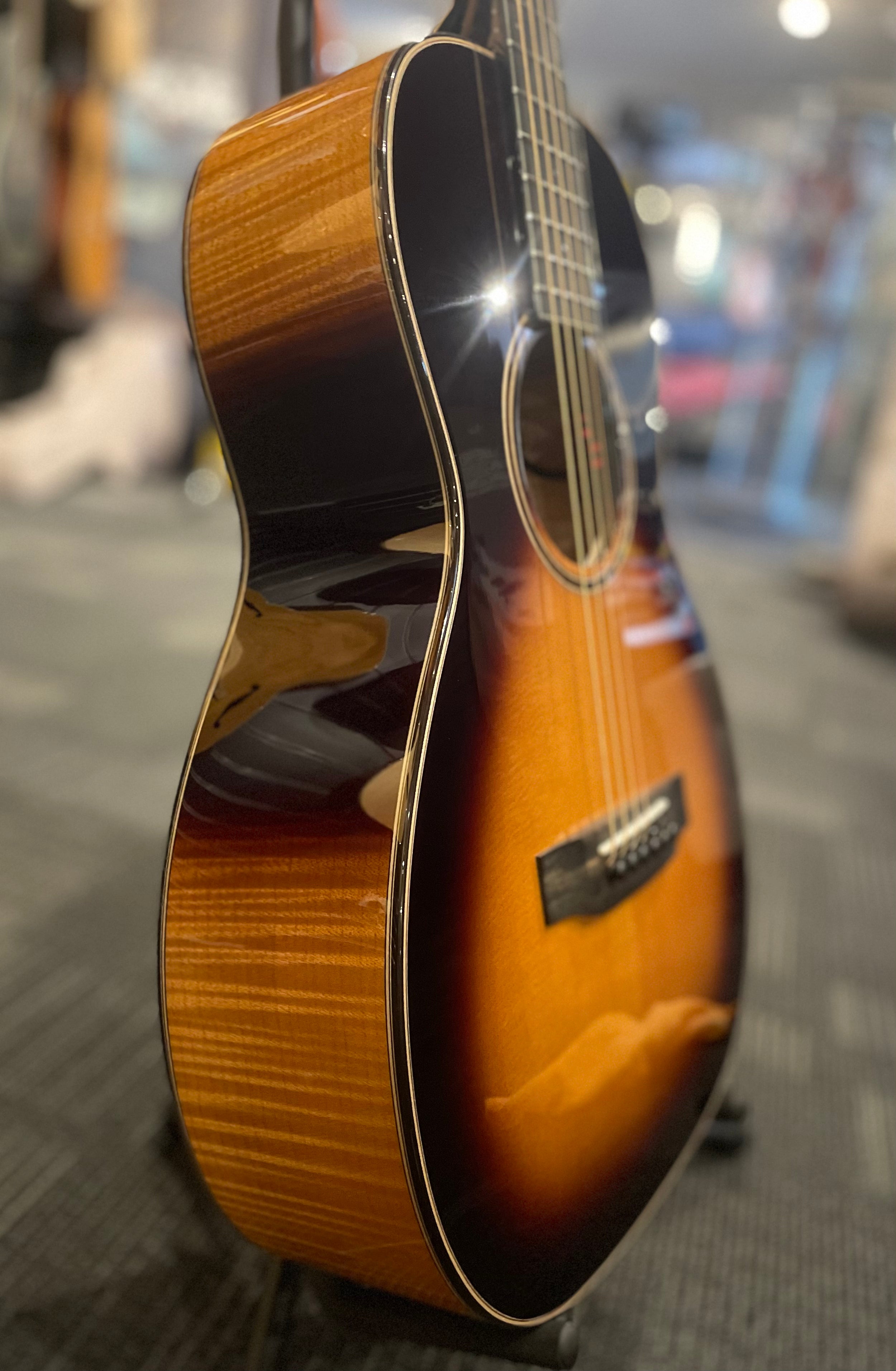 Small and mighty! This sweet little 12-fret join parlour certainly packs a punch. The slightly deeper body allows the guitar to resonate with a volume and presence not usually heard in guitars of this size. Includes a sturdy hard-shell case.